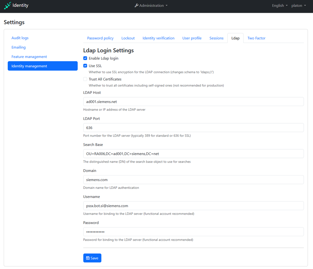 UseSsl | Whether to use SSL for the LDAP connection (LDAPS) | true |